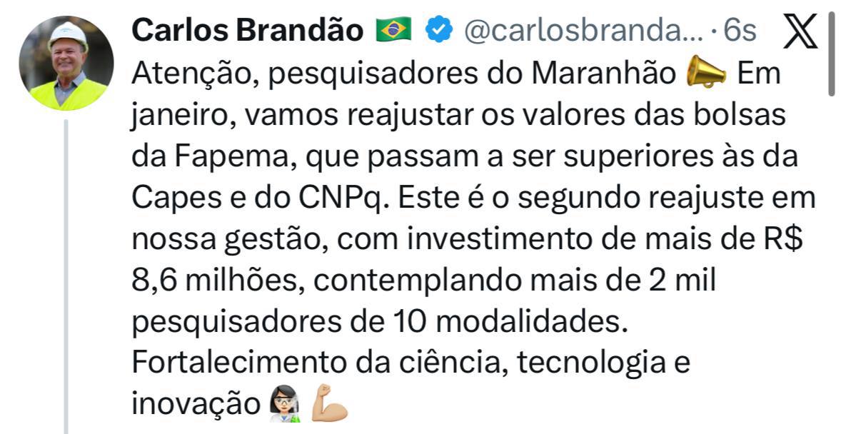 “O reajuste das bolsas da Fapema reafirma o compromisso do nosso governo com a valorização da pesquisa e de quem produz conhecimento em nosso estado. Essa medida integra uma política contínua de fortalecimento da ciência, da tecnologia e da inovação. Hoje, o Maranhão é reconhecido como o terceiro estado que mais investe recursos próprios em tecnologia no Brasil. Só em 2024, foram quase R$ 65 milhões destinados para impulsionar a pesquisa, o desenvolvimento acadêmico e científico, ajudando a transformar o futuro”, destaca o governador Carlos Brandão.