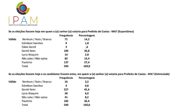 O Instituto IPAM (Morais & Dias Instituto de Opinião Pública LTDA. ME) realizou uma pesquisa em Caxias, onde ouviu 500 eleitores, entre os dias 30 de agosto e 1º de setembro. A pesquisa foi registrada no Tribunal Superior Eleitoral (TSE) sob o número MA-03113/2024. A pesquisa foi contrata pela empresa Ferplan Consultoria e Assessoria Contábil LTDA.