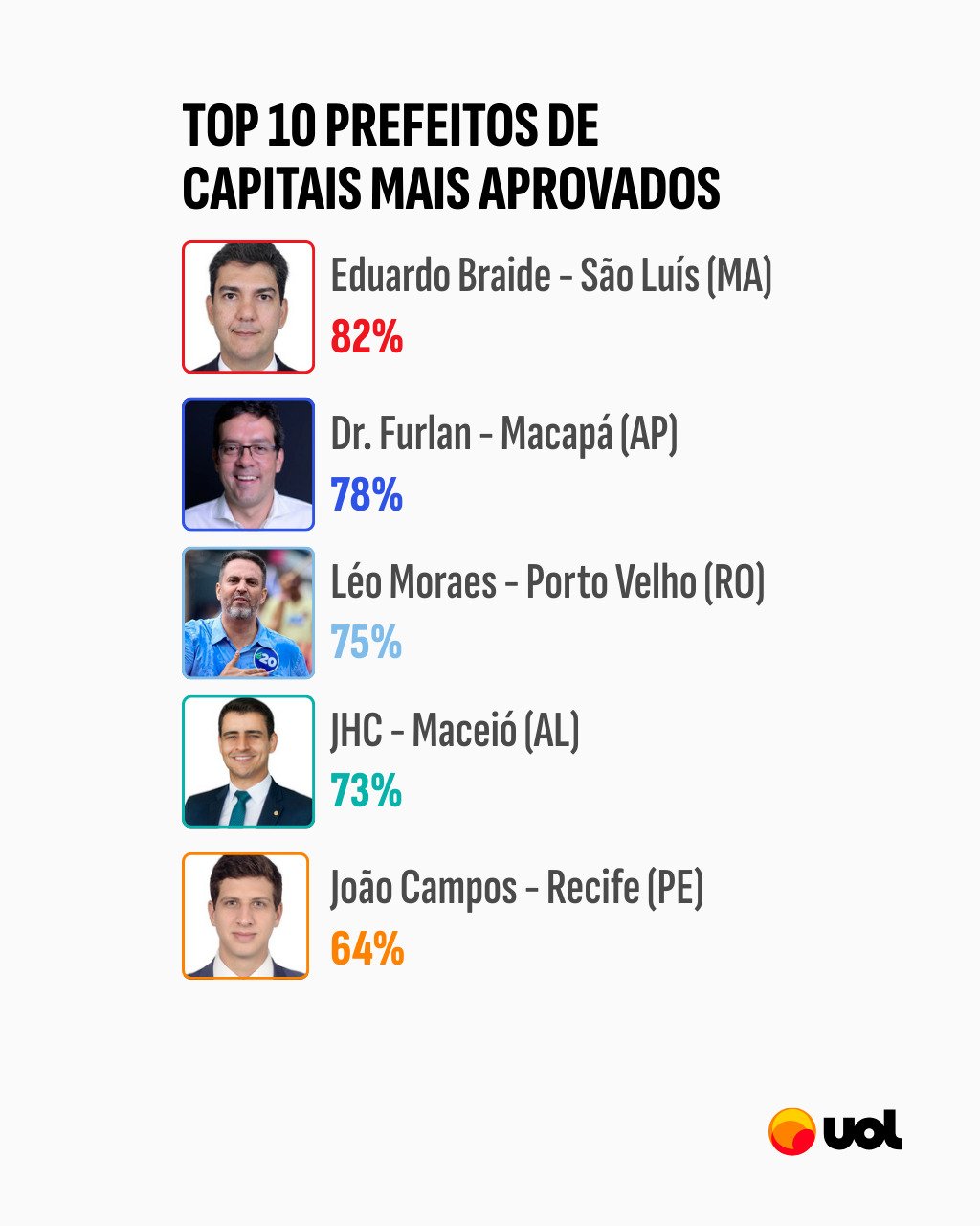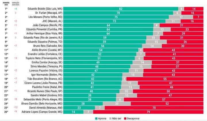 A pesquisa AtlasIntel aponta o prefeito de São Luís, Eduardo Braide (PSD), como o mais bem avaliado do Brasil. Ele lidera o ranking com 82% de aprovação, à frente de Dr. Furlan (MDB), em Macapá (78%), e Léo Moraes (Podemos), em Porto Velho (75%). O levantamento entrevistou 82.781 pessoas por meio de questionários online entre os dias 6 de outubro e 5 de dezembro.